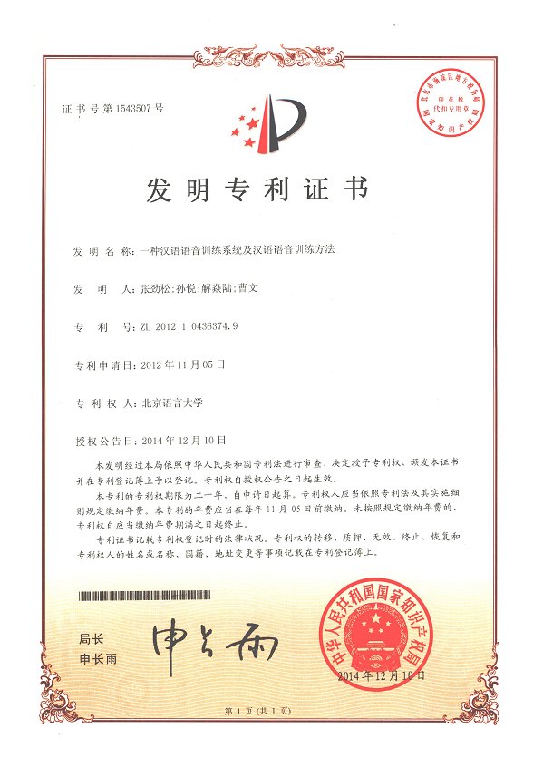 【专利名称】一种汉语语音训练系统及汉语语音训练方法 【专利号】ZL 2012 1 0436374.9 【专利权人】北京语言大学 【发明人】张劲松;孙悦;解焱陆;曹文 【授权公告日】2014年12月10日 【应用目标】 帮助日本留学生快速习得汉语普通话的阳平和上声。 【成果简介】 本发明提供一种汉语语音训练系统及汉语语音训练方法,该系统包括:连续统设计模块获取用户根据被试者的感知偏误和已有的汉语语音理论设计出的有针对性的声学连续统;合成语音模块将连续统设计模块设计完的声学连续统转化成合成语音;中国人感知常模模块通过对中国人合成语音进行听辨,获取的对声学连续统的中国人感知常模;音节结构设计模块获取用户找到针对被试者水平的音节结构,设计出的训练顺序;自然语音语料库模块按照音节结构设计模块设计的训练顺序,抽取出所需的自然语音语料;训练模块利用所述自然语音语料和所述中国人感知常模,供被试者进行汉语语音训练。其使留学生能够在短时间内掌握汉语语音间的主要区别,迅速提高听辨正确率 | ||||