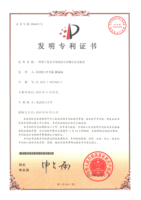 【专利名称】一种基于发音节奏的语音评测方法及装置 【专利号】ZL 2012 1 0473420.2 【专利权人】北京语言大学 【发明人】张劲松;时书菊;解焱陆 【授权公告日】2015年2月11日 【应用目标】 实现外国学生汉语发音节奏的自动评测。 【成果简介】 本发明设计一种基于发音节奏的语音评测方法及装置,该装置包括:GMM模型获取单元用于从被评测语音中选出训练数据,提取出所述训练数据的节奏特征参数进行训练得到GMM模型;似然度获取单元提取被测评语音的节奏特征参数作为所述GMM模型的输入,经GMM模型匹配获取相应的似然度值;评测模型获取单元用于所述似然度经过训练评测模型,根据所述评测模型对被评测语音的发音节奏进行评测。本申请所提出的技术方案用于辅助语言教学,尤其是对外汉语的教学,满足了学生学习语言的需要。另外,能及时发现学生的语音节奏中的偏误并给予他们有效的反馈,将会提高他们的语言学习效率。尤其在与日本学生学习汉语方面。 | ||||
