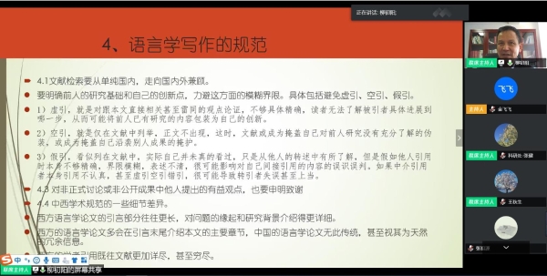 为有效提升我校师生的科研能力和学术水平,科研处特推出“主编系列学术讲座”,为广大师生在论文写作和论文发表方面提供有针对性的学术指导。 4月22日下午,“主编系列学术讲座”第1讲以在线直播的形式隆重开讲。《中国语文》主编刘丹青研究员应邀作为主讲嘉宾,做了题为《语言学写作的旨趣与规范》的讲座。本场讲座吸引了我校对语言学写作感兴趣的300名师生前来聆听。我校副校长张旺喜教授出席了本场讲座。讲座由科研处处长张健教授主持。 刘丹青研究员在线开讲 在本场讲座中,刘丹青研究员主要从语言学写作写什么和怎么写、怎样符合学术论文的要求及为什么学术论文要这样写几个方面,从务实和务虚两个角度进行了广泛而深入的介绍与阐释。全场讲座共分四大部分:一、语言学写作的性质。语言学写作是一种学术写作,也是一种科学写作。语言学写作不是一种纯个人行为,而是参与学术共同体的一种表达和交流行为;二、语言学写作的宗旨。语言学论文提供研究者经过自己或自己团队的研究所获得的关于语言学的新知新见。新的方面主要包括对象之新、理论之新、观点之新、材料之新、方法之新。创新的前提是对已知研究的充分了解和引述;三、语言学写作之趣。科学整体上是个巨大的立体网络系统,要考虑论文选题在科学系统中的地位,即文章的学科内和跨学科的辐射力、穿透力、覆盖面;四、语言学写作的规范。文献检索要从单纯国内走向国内外兼顾。要明确前人的研究基础和自己的创新点,力避这方面的模糊界限,具体包括避免虚引、空引、假引。对非正式讨论或非公开成果中他人提出的有益观点,也要申明致谢。注意中西学术规范的一些细节差异。 讲座过程 在结语部分,刘研究员表达了自己对北语师生以及广大语言学研究者在语言学写作方面的殷切希望,即语言学共同体得“旨”,语言学者个人得“趣”,为了达成旨趣,守好学术规范。 讲座最后,刘研究员还对热心听众提出的问题予以了耐心细致的解答。刘丹青研究员的本场讲座视角开阔、论证严谨、旁征博引、深入浅出,对我校师生的科研和学术论文写作具有很强的指导意义。 在线听众 讲座结束后,科研处处长张健教授发表了致谢感言。她提到,刘丹青研究员多年以来一直是CSSCI核心期刊《中国语文》的主编,同时也是语言学方向的知名专家学者,疫情期间拨冗为我校师生献上这场学术盛宴,相信大家一定会受益匪浅。科研处致力于为我校广大师生提供科研服务,疫情期间将继续以在线直播的形式,开展各学科的学术讲座。 主讲人简介: 刘丹青研究员现任中国社会科学院语言研究所所长,《中国语文》主编,Asian Languages and Linguistics联合主编,中国社会科学院大学特聘教授、研究生院语言学系主任、博士生导师,中国社会科学院辞书编纂研究中心主任,兼任国家语委委员,《中国大百科全书(第三版)·语言文字》卷主编,南开大学博导。他的研究兴趣主要包括语言类型学、汉语语法学、方言学,致力于将具体语言现象置于人类语言共性和类型差异的大背景下考察。出版著作10余种,发表中英文论文180余篇。 | ||||