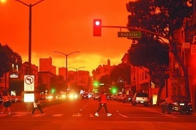 美国加利福尼亚州北部山火连日燃烧,形成的烟尘遮天蔽日。受其影响,九月九日正午时分,旧金山仍如夜晚般昏暗。图为九日中午拍摄的旧金山街景。新华社发