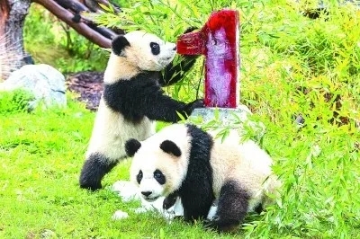8月31日,在德国柏林动物园,大熊猫双胞胎“梦想”和“梦圆”在嬉戏。 新华社发