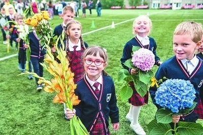 九月一日,在立陶宛首都维尔纽斯,学生手持鲜花参加开学典礼。新华社发